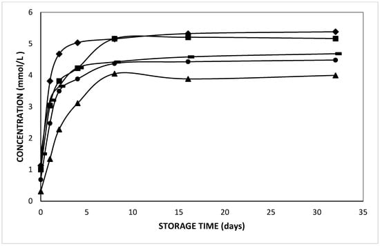 Regarding the results of the double emulsions containing LCT oil, the volume weighted average droplet size was about 50 µm directly after preparation and increased up to about 60–65 µm at 37 °C within 16 days (Figure 1). The significant increase in volume weighted average droplet size (D[4,3]) during 16 days was confirmed for all double emulsions containing high oleic sunflower oil (HOSO) by regression analysis (p < 0.05). It should be noted that the volume-weighted average diameter of the different samples considered in Figure 1 varied from 49.4 to 56.5 µm directly after preparation. Considering that these samples were independently prepared and hence might have experienced small differences in homogenization intensity, it follows that the effect of the enclosed hydrophilic compound on the particle size of the different double emulsions was limited. This is especially true, considering the fact that the volume-weighted average droplet diameter of two independently prepared double emulsions containing 5 mmol/L L-leucine (at pH 7.0) was 50.2 and 53.1 µm, respectively, directly after preparation.
