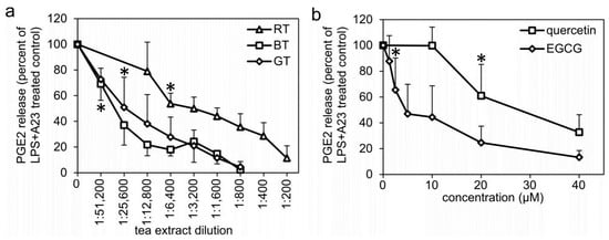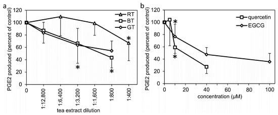 Cellular assay for the combined enzymatic activity of cPLA2, COX and PGE synthases to produce PGE2 in LPS-pretreated (24 h) monocytes during a 1 h treatment with (a) tea extracts; (b) EGCG or quercetin. PGE2 formation was initiated by stimulation with 4 µM A23187 during the last 45 min of the 1 h treatment with tea extracts or polyphenols. Results for each data point represent the mean value ± SD of 2–7 independent experiments from different monocyte preparations, and are expressed as percent of PGE2 released from the LPS + A23187-treated controls. * denotes a significant inhibition (p < 0.05). BT: black tea extract, GT: green tea extract, RT: Rooibos tea extract, EGCG: epigallocatechin gallate.