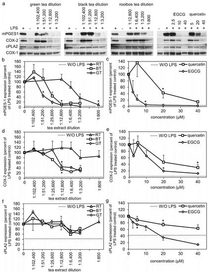 (a) Representative Western blots of mPGES-1, COX-1, COX-2, and cPLA2 expression in human monocytes after indicated treatments for 24 h. (b–g) Densitometric quantification of Western blot results compared to LPS treatment alone. COX-1 expression was used as the internal loading control. Results for each individual data point represent mean value ± SEM of 1–5 independent experiments with human monocytes from different preparations. Dotted lines (b–g) indicate the basal expression (without LPS treatment) of each protein. BT: black tea extract, GT: green tea extract, RT: Rooibos tea extract, EGCG: epigallocatechin gallate. * denotes the highest dilution/lowest concentration mediating a significant inhibition (p < 0.05). Uncropped versions of the Western blots are shown in Supplementary Materials, Figure S1.
