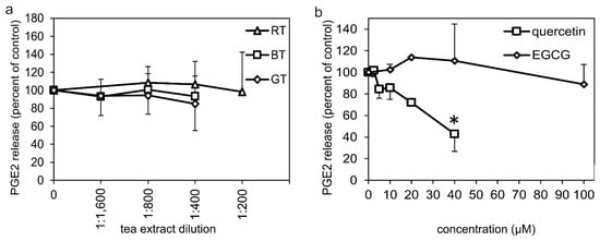 In addition to the cellular assay, a cell-free assay for the direct effects of tea extracts, EGCG, or quercetin on the combined enzymatic activity of COX and PGE synthases was also performed. Green and black tea extracts inhibited PGE2 formation in a dose-dependent manner, with similar potency, while the Rooibos tea extract was less potent (Figure 4a). Quercetin and EGCG also dose-dependently inhibited PGE2 formation down to 50% of the control, at approximately 20 µM and 40 µM, respectively (Figure 4b). For comparison, indomethacin (10 µM) inhibited PGE2 formation down to 26 ± 15% of the control (n = 6, p < 0.05).