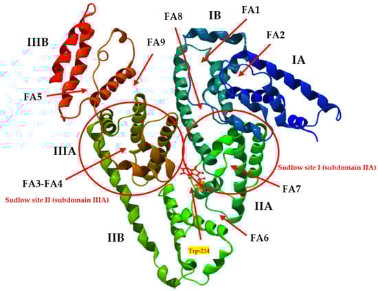 Apart from the two main versatile ligand binding sites with a high affinity for diverse molecules referred to as ‘Sudlow’s sites’—site I (located in subdomain IIIA) and site II (in subdomain IIA) [9]—there are nine fatty acid binding sites in the HSA molecule (i.e., FA1–FA9), which are arranged in an asymmetrical manner and include all six subdomains [10] (Figure 1).