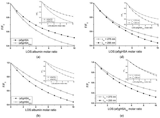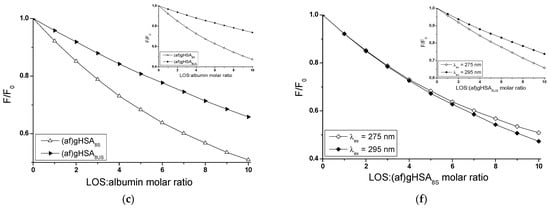 Fluorescence quenching of (a) (af)gHSA, (af)gHSAphys, (b) (af)gHSA4S, (af)gHSA4US, (c) (af)gHSA8S, (af)gHSA8US complexed with LOS (5 × 10−6 mol∙L−1–5 × 10−5 mol∙L−1), λex = 275 nm (in the main view), λex = 295 nm (in the insert) and fluorescence quenching of (d) LOS-(af)gHSA, (e) LOS-(af)gHSA4S, (f) LOS-(af)gHSA8S system (in the main view) and (d) LOS-(af)gHSAphys, (e) LOS-(af)gHSA4US, and (f) LOS-(af)gHSA8US system (in the insert) for λex = 275 nm and λex = 295 nm; the albumin concentration was 5 × 10−6 mol∙L−1; the error bars are smaller than the symbols.