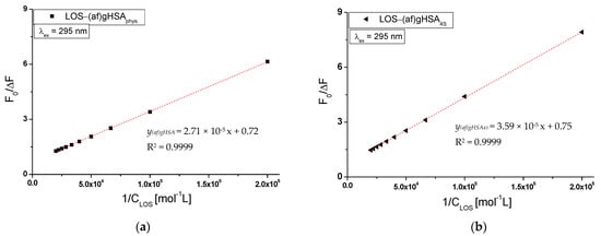 From the F0/F = f[CLOS] relationship for a system with a linear course of the Stern–Volmer curve, the Stern–Volmer constants KSV, the bimolecular quenching rate constants kq and maximum available fluorescence fraction fa of all albumin fluorophores were determined. Quenching parameters (KSV, kq = KSV/τ0) and fa for a system with non-linear Stern–Volmer relationship (LOS-(af)gHSAphys (Figure 4d) and LOS-(af)gHSA4S (Figure 4e) for λex = 295 nm) were determined from F0/∆F = f(1/[CLOS]) relationship represented by Stern–Volmer equation modified by Lehrer (Equation (3)) [21]. The plot of F0/∆F vs. 1/[CLOS] is found to be linear with the intercept on the ordinate (Figure 5a,b). The reciprocal of the intercept gives the value of fa while the intercept/slope gives the value of the Stern–Volmer constants KSV. The obtained results have been collected in Table 2.