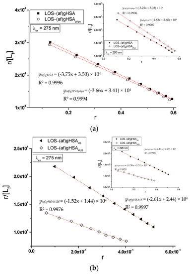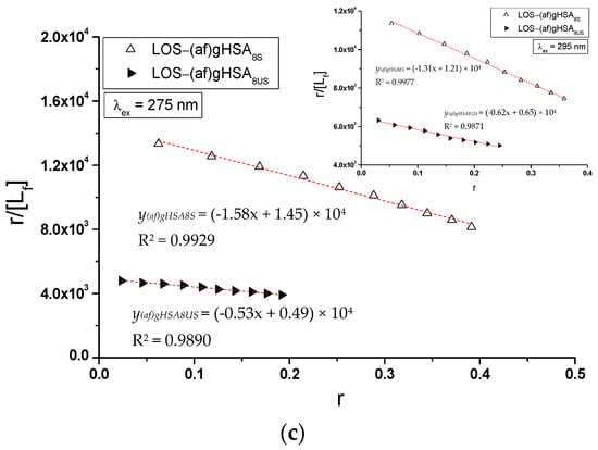 The Scatchard curves of r/[Lf] vs. r for (a) LOS-(af)gHSA and LOS-(af)gHSAphys, (b) LOS-(af)gHSA4S and LOS-(af)gHSA4US, and (c) LOS-(af)gHSA8S and LOS-(af)gHSA8US systems, λex = 275 nm (in the main view), λex = 295 nm (in the insert); the error bars are smaller than the symbols.