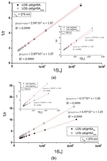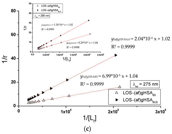 The Klotz curves of 1/r vs. 1/[Lf] for (a) LOS-(af)gHSA and LOS-(af)gHSAphys, (b) LOS-(af)gHSA4S and LOS-(af)gHSA4US, and (c) LOS-(af)gHSA8S and LOS-(af)gHSA8US systems, λex = 275 nm (in the main view), λex = 295 nm (in the insert); the error bars are smaller than the symbols.