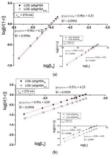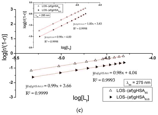 The Hill curves of log[r/(1-r)] vs. log[Lf] for (a) LOS-(af)gHSA and LOS-(af)gHSAphys, (b) LOS-(af)gHSA4S and LOS-(af)gHSA4US, and (c) LOS-(af)gHSA8S and LOS-(af)gHSA8US systems, λex = 275 nm (in the main view), λex = 295 nm (in the insert); the error bars are smaller than the symbols.