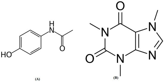 Paracetamol (Figure 1A) is the commonly administered anti-inflammatory and antipyretic medicine, especially in case of pediatric and geriatric patients [,]. It is commercially available in a wide range of dosage forms []. Caffeine (Figure 1B) is a pseudo-alkaloidal drug that is commonly used in combination with paracetamol [,]. The combination of paracetamol and caffeine is the world’s most widely used combination []. As a result, the qualitative and quantitative standardization of caffeine and paracetamol in commercially available formulations is necessary.