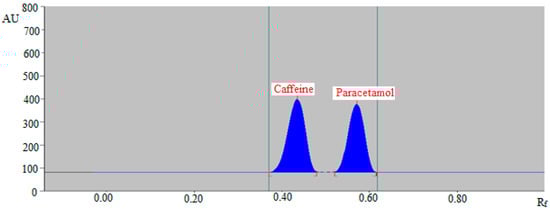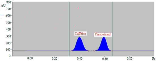 Normal-phase high-performance thin-layer chromatography (HPTLC) chromatogram of standard caffeine and paracetamol.