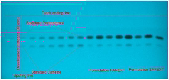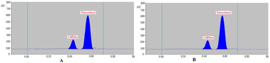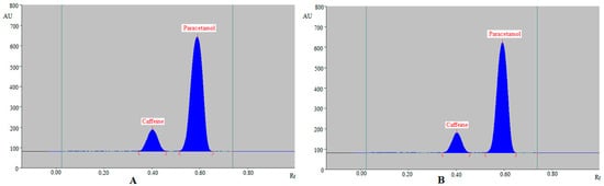 The chromatograms of caffeine and paracetamol from commercial tablets were identified by comparing their TLC spots at Rf = 0.43 ± 0.01 for caffeine and Rf = 0.57 ± 0.02 for paracetamol with those of standards caffeine and paracetamol using the greener reversed-phase HPTLC approach. Figure 7 summarizes the recorded chromatograms of caffeine and paracetamol in the commercial tablets PANEXT (Figure 7A) and SAFEXT (Figure 7B), which also showed identical peaks of caffeine and paracetamol to those of standards caffeine and paracetamol in both commercial tablets.