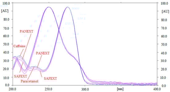 Superimposed ultra-violet (UV) absorption spectra of standard caffeine and paracetamol and caffeine and paracetamol in PANEXT and SAFEXT.