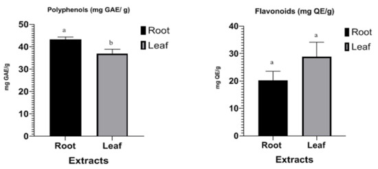 The flavonoids content was determined from the calibration curve of quercetin: y = 0.0019x + 0.0558 and R2 = 0.9844 and expressed in mg EQ/g extract. Our results indicated that the flavonoid content in the roots was 20.29 ± 3.29 mg EQ/g extract and that in the leaves was 28.88 ± 5.28 mg EQ/g extract (Figure 1). Previous studies found that phenolic compounds, including flavonoids, possess strong antioxidant activity and exert health benefits [25].