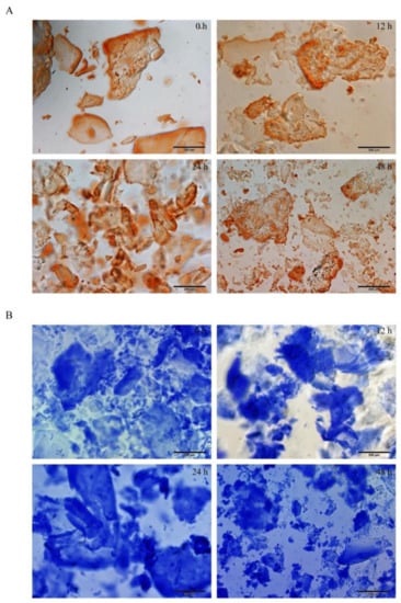 The results of the Congo red/aniline blue staining of peptide DRF3. (A) Congo red staining results of peptide DRF3 at 0 h, 12 h, 24 h and 48 h; (B) aniline blue staining results of peptide DRF3 at 0 h, 12 h, 24 h and 48 h.