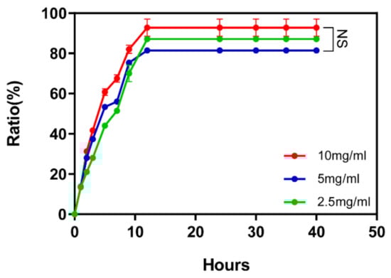 To test the controlled release effect of DRF3, we tested its controlled release effect on OVA. The results show that at the 12th h, the three concentrations of DRF3 complete the controlled release of proteins. The controlled release rate of DRF3 to OVA reached 97% at 10 mg/mL, 82% at 5 mg/mL and 88.6% at 2.5 mg/mL (Figure 9).