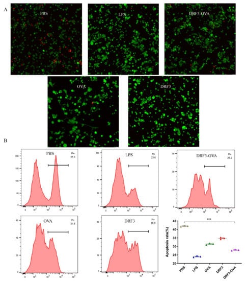 PBS, LPS, OVA, DRF3, and DRF3-OVA were co-cultured with DC, respectively. PBS was negative control, LPS was a positive control. The effect of DRF3 on DC survival was analyzed by fluorescence-activated cell sorting (FACS).