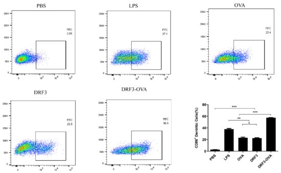 Flow cytometry results show that the percentage of CD86 was 2.85% in the PBS group, 37.1% in the LPS group, 23.4% in the OVA group, 22.8% in the DRF3 group, and 56.9% in the DRF3-OVA group (Figure 12). Compared with the PBS group, other groups significantly increased the percentage of CD86. Meanwhile, the percentage of CD86 in the DRF3-OVA group was more than twice that in the OVA and DRF3 groups alone.