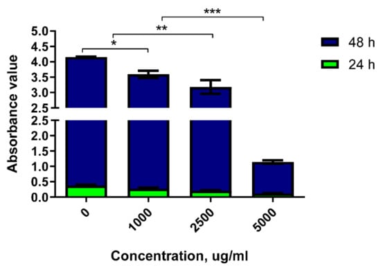 The toxicity of DRF3 on MCF-7 cells at different concentrations (the results were repeated three times, shown as mean ± SEM; * means significant differences p < 0.05; ** means significant differences p < 0.01; *** means significant differences p < 0.001).