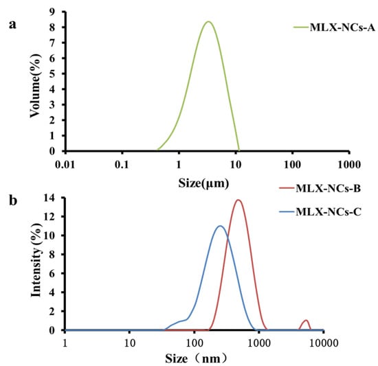 Particle size distributions of (a) MLX-NCs-A; (b) MLX-NCs-B and MLX-NCs-C.