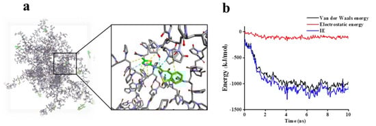 According to Figure 4, PVP-k17 was evenly distributed around MLX (Figure 4a), and there were hydrophobic interactions and hydrogen bonds between PVP-k17 molecules and MLX molecules. The interaction energy (IE) between MLX and PVP-k17 included electrostatic interaction and van der Waals energy (Figure 4b). The van der Waals energy was clearly stronger than the electrostatic interaction. IE was governed by van der Waals energy, and reached a stable state after about 4 ns. The van der Waals energy decreased in the first 4 ns, and was at a stable state after 4 ns, with a magnitude of about −1000 kJ/mol. In contrast, the electrostatic interactions were incredibly steady throughout the simulation process, and the magnitude was approximately −100 kJ/mol. The energy between systems tended to be stable after 4 ns. From an energy point of view, the MLX molecules and PVP-k17 molecules were both in a stable system.