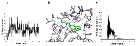 Hydrogen bonds and contact conditions between MLX and PVP-k17. (a) Distribution diagram of the number of hydrogen bonds; (b) the hydrogen bond formed in the system; (c) average number of contacts between MLX and PVP-k17 in the range of 0–6 nm.