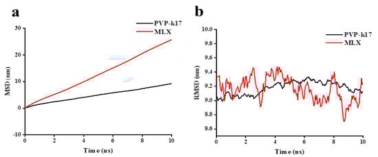 In addition to the analysis above, an investigation of the mobility between molecules was also provided during the simulation. PVP-k17 was relatively stable beyond 10 nm during the simulation, and the MSD changed marginally. However, the MSD of MLX fluctuated greatly below 30 nm (Figure 6a); the corresponding RMSD fluctuated in the range of 8.8–9.4 nm, and PVP-k17 fluctuated in the range of 9.0–9.2 nm (Figure 6b). As the MSD and RMSD results show, MLX was in an unstable state in the water, and the degree of movement within 0–10 ns was relatively large compared to the degree of PVP-k17. The fluctuation trend of MLX was larger than PVP-k17, since the molecular weight of PVP-k17 is almost 20 times that of MLX, and MLX is a small-molecule drug compared with the macromolecular drugs; therefore, its movement in the system is more flexible [30]. Therefore, the fluctuation was within the normal range, and the system tended to be integrally dynamically stable.