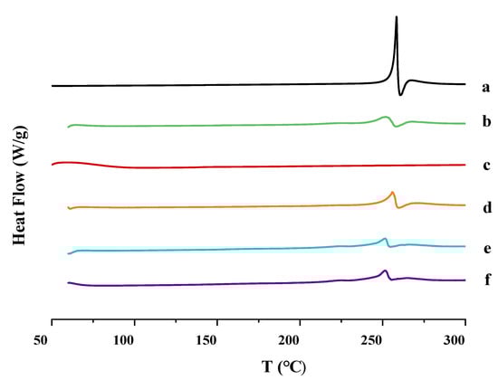 Differential scanning calorimetry graphs (DSC). (a) Pure MLX material; (b) physical mixture; (c) PVP-k17; (d) MLX-NCs-A; (e) MLX-NCs-B; and (f) MLX-NCs-C.