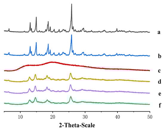 Powder X-ray diffractometry graphs (PXRD). (a) Pure MLX material; (b) physical mixture; (c) PVP-k17; (d) MLX-NCs-A; (e) MLX-NCs-B; (f) MLX-NCs-C.