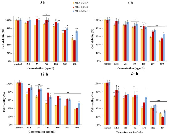 Cell cytotoxicity following MLX-NCs-A, MLX-NCs-B, and MLX-NCs-C treatments for the Caco-2 cell (mean ± SD., n = 6,* p < 0.05, ** p < 0.01, *** p < 0.001 in comparison to the untreated control).