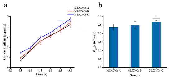 Cumulative amounts and Papp of MLX-NCs-A, MLX-NCs-B, and MLX-NCs-C transport across Caco-2 cell monolayers (mean ± SD., n = 4). (a) Curve of transport amount over time within 3 h (b) the permeability coefficient (Papp) at 3 h for MLX-NCs-A, MLX-NCs-B, and MLX-NCs-C, * p < 0.05 in comparison to the MLX-NCs-A.