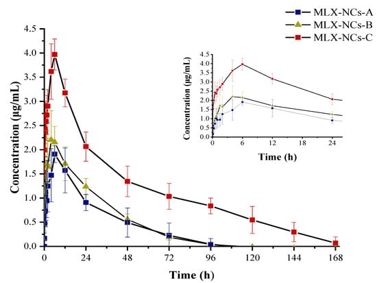 Plasma concentration–time curves of MLX-NCs-A, MLX-NCs-B, and MLX-NCs-C in rats after oral administration (mean ± SD., MLX-NCs-A and MLX-NCs-B n = 7; MLX-NCs-C n = 6).