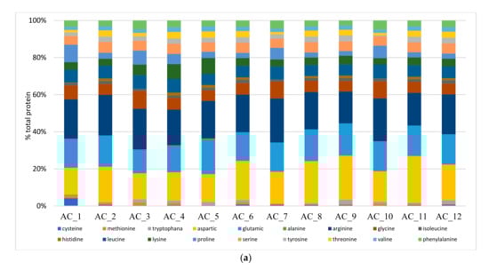 With reference to the best performing ACs, it can be seen that AC_1 showed an AA composition similar to that of AC_10, in particular for Pro, Gly and Met contents (Figure 2a) that were more abundant than those of AC_12. However, AC_12 showed significantly more abundant EAAs, namely His, Thr, Val and Ile. AC_12 also displayed the second most abundant Trp content, i.e., 50% more than that reported for AC_10, while Trp was not found in AC_1 (Figure 1a). Trp has often been found to be the limiting EAA when assessing the nutritional value of algal proteins [] in most algae species.