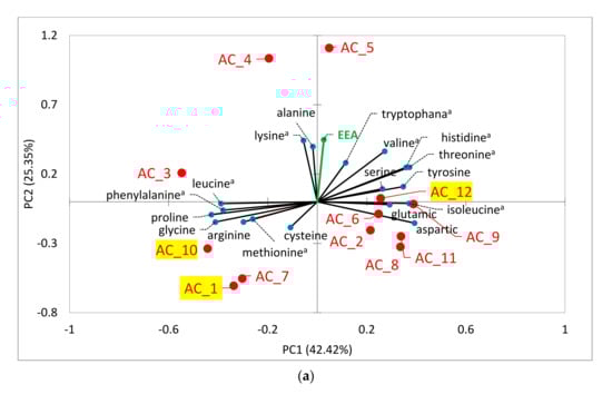 In any case, the three best performing ACs showed relatively low EAA content, representing 20.9 (AC_1), 22.5 (AC_10) and 25.1 (AC_12) g 100 g−1 of crude protein, and even for AC_1 and AC_10 EAA contents were lower than the AC average, confirming that higher growth limits protein and EAA contents. Figure 2a suggests that the best performing ACs showed lower EAA contents than those ACs characterized by lower growth rates, especially AC_3, AC_4 and AC_5 (Table S2). Therefore, the least performing ACs (e.g., AC_3, AC_4 and AC_5), due to the high EAA contents and excellent EAA profiles, could be considered healthy and functional for foods.