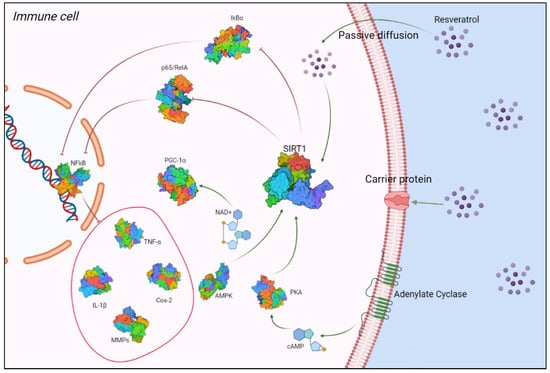RSV crosses the membrane by three mechanisms, namely passive diffusion, endocytosis via lipid rafts, or by carrier-mediated transport, binding to receptors such as integrin αvβ3. Once in the cell, it activates SIRT1, which inhibits RelA acetylation and promotes inhibitor protein-B (IkB) degradation, lowering NF-kB-induced production of TNF-α, IL-1, IL-6, MMPs, and COX-2. Protein kinase A (PKA) is activated by cyclic adenosine monophosphate (cAMP) levels, which activate SIRT1. SIRT1 activity is controlled by AMP-activated protein kinase (AMPK), which regulates cellular levels of nicotinamide adenine dinucleotide (NAD+). Increased NAD+ levels activate SIRT1, which promotes deacetylation and activation of peroxisome proliferator-activated receptor-gamma coactivator 1-alpha (PGC-1)α, which is downstream of AMPK.