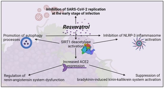 85. Yang, M.; Wei, J.; Huang, T.; Lei, L.; Shen, C.; Lai, J.; Yang, M.; Liu, L.; Yang, Y.; Liu, G.; et al. Resveratrol inhibits the replication of severe acute respiratory syndrome coronavirus 2 (SARS-CoV-2) in cultured Vero cells. Phytother. Res. 2021, 35, 1127–1129. [Google Scholar] [CrossRef]