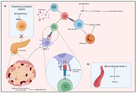 Diabetes mellitus (DM), a group of chronic metabolic diseases characterized by hyperglycemia, is one of the most serious consequences of obesity, caused mainly by a total or partial dysfunction of the Langherans islands of the pancreas, responsible for the production of insulin, the hormone that regulates blood glucose levels. In 2017, the disease affected about 451 million people, and this number could increase to 693 million by 2045 [103]. Often, the various vascular complications caused by hyperglycemia, together with oxidative stress and inflammation, are the primary reason for morbidity and mortality associated with diabetes [104]. RSV, however, has potent antioxidant and anti-inflammatory activities, acting directly on lipid peroxidation and removing superoxide free radicals. By activating SIRT1, RSV induces the deacetylation of the transcription factor Forkhead box O (FoxO), involved in cell apoptosis, and increases the expression of SOD, which has a key antioxidant role [105]. The absorption of β cell antigens by islet resident DCs, presentation to naive T cells, and promotion of Th1 development will activate B lymphocytes, which will create autoantibodies against beta cells. Th1 will also trigger macrophage and neutrophil migration to the islet, which will increase ROS and enhance β cell death. RSV works through: (a) binding to C-C chemokine receptor (CCR)6, which inhibits Th1 cell migration; (b) creating a complex with insulin, which stimulates glucose intake. RSV also reduces ROS and boosts antioxidant capacity by inhibiting apoptotic cell damage during oxidative stress via SIRT1. RSV also aids in the regeneration of beta cells in the pancreas (Figure 4).