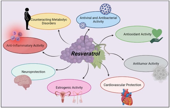 Resveratrol (RSV) (3,4,5-trans-trihydroxy-stilbene), a phenolic compound found in red fruits and berries, in particular in grapes pulp, skin, seeds, and stems [7], exhibits a wide range of highly active biological effects to counteract the onset of many diseases or to manage their symptoms [8]. One of the possible mechanisms by which resveratrol plays its role in maintaining health is the suppression of inflammatory reactions by acting on immune cells [9]. RSV has antioxidant, anticarcinogenic, anti-inflammatory, neuroprotective, cardioprotective, and anti-aging properties [10,11]. This natural flavonoid can mitigate toxicities related to chemo-radiation therapy in normal tissues [12] and enhance migration of cells toward injured areas, which is important from therapeutic standpoints [13]. It also has modulatory effects on the tumor microenvironment [14]. Furthermore, this polyphenol is also involved in the maintenance of liver metabolism [15], interacts and strengthens the immune system [16], and acts on the nervous system [17]. Some studies report the neuroprotective effect of RSV against neurodegeneration, which sees its genesis in an impaired mitochondrial function [18]. RSV crosses the blood-brain barrier to counteract oxidative damage in hippocampal neurons and glial cells [19]. It has been described that RSV can activate the Silent Information Regulator 1 (SIRT1), a type of histone deacetylase, to protect neurons against apoptosis, inflammation, and oxidative stress in the treatment of neurological disorders such as Parkinson’s disease [20]. It also modulates cholinesterase activity and preserves dopaminergic neurons, which enhance learning and memory. It has been shown that RSV can reverse social dysfunctions. Recent studies have suggested the effect of RSV in improving panic and anxiety behaviors [21,22]. Recent studies have shown that stilbenes, in particular trans-RSV [23] and its glucoside, are able to bring numerous benefits to human health, showing antioxidant, cardioprotective, and antitumoral effects [24,25]. Several studies prove the use of this phenolic compound in the treatment and prevention of diseases with tumor etiology, helping to stop uncontrolled cell growth and consequently suppress cancerous neoformations [26]. The cardioprotective activity of RSV is associated with the inhibition of platelet aggregation and oxidation of low-density lipoproteins (LDL), followed by increased artery vascular relaxation [9]. Several clinical studies have shown that RSV may be useful for diabetic patients. The therapeutic effect of this compound on diabetes is complex and includes several beneficial functions [27]. The use of RSV, alone or in combination with modern antidiabetic therapies, may become an effective treatment for diabetes mellitus or its complications [9]. Since RSV is a natural antibacterial agent, researchers are increasingly using it to treat acute inflammation and chronic illnesses [28].
