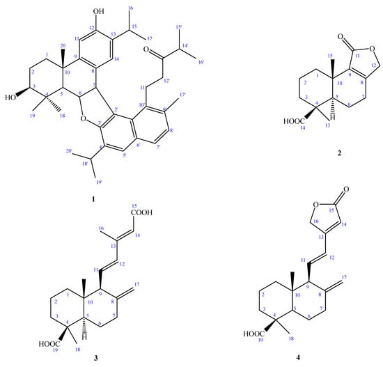 - Iwamoto, M.; Ohtsu, H.; Matsunaga, S.; Tanaka, R. Labdane-type diterpenes and a nordrimane-type sesquiterpene from the stem bark of Thuja standishii. J. Nat. Prod. 2000, 63, 1381–1383. [Google Scholar] [CrossRef] [PubMed]