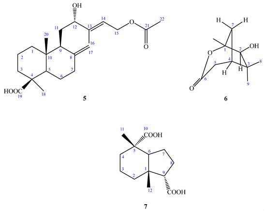 - Kuo, Y.H.; Yu, M.T. Three Labdane-Type Diterpenes from the Bark of Juniperus formosana HAY. var. concolor HAY. Chem. Pharm. Bull. 1996, 44, 1242–1244. [Google Scholar] [CrossRef]
