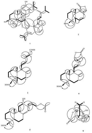 Observed from the HMBC spectrum, δH 4.54 and 4.59 (each 1H, d, J = 17.0 Hz, H-12) are correlated to δC 172.3 (C-11), 159.5 (C-8), 134.4 (C-9), and 25.6 (C-7), so it is confirmed to be a conjugated γ-lactone. Then, according to the correlation between δH 1.28 (s, 3H, H-13) and δC 183.4 (C-14), 53.2 (C-5), 37.5 (C-3), and 35.4 (C-4) and δH 1.04 (3H, s, H-15) and δC 134.4 (C-9), 53.2 (C-5), 34.6 (C-1), and 43.4 (C-10) being related, it can be determined that δH 1.28 (3H, s) and carborylic acid (COOH) are connected to C-4. The NOE correlations of H-13/H-3, H-13/H-5, and no NOE contacts of H-15/H-13, 5 confirmed a trans-fused decalin ring in 2. The orientation of C-15 being positioned at the axial and C-13 being located on the equatorial were confirmed. The double bond with oxygen was in position C-11 and not on C-12 based on the NOE correlations of H-7/H-12 and aided by the HMBC correlation between δH 4.54, 4.59 (H-12) and δC 25.6 (C-7). The 1H- and 13C-NMR (Table 1), HMBC (Figure 2), COSY (Figure 2), and NOESY (Figure 3) were compatible with the structure of 2 as in Figure 1, named chamaecyformosanin B.