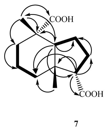 Compound 7 was obtained as an optically active colorless gum ([α+ 42.4 (c 0.13, CHCl3)) and showed a molecular ion M+ peak at m/z 240.1367 for C13H20O4, corresponding to four indices of hydrogen deficiency (IHD). The IR spectrum of 7 displayed absorptions for COOH groups (2500~3300 cm−1) and COOH (1697 cm−1). The 1H- and 13C-NMR (Table 2), COSY (Figure 2), HMBC (Figure 2), and NOESY data (Figure 3) established the structure of 7 as (1b,4b,5a,10a)-1,4-epoxymuurolan-5-ol. The 13C-NMR spectrum exhibited 13 signals for two Me, five CH2, and two CH groups, and for four quaternary C atoms (including two COOH (δC 184.3 (C-10) and 180.2 (C-13)). After deducting the two groups of carboxyl groups, the remaining unsaturation is 2, plus the two methyl groups of δH 1.21 (Me-11) and 0.62 (Me-12), leaving compound 7 with nine carbons. Further use was made of 2D-HMBC to find the following correlations (Figure 2): from CH3-11 (δH 1.21 (3H, s)) to C-10 (δC 184.3), C-6 (δC 57.9), C-5 (δC 43.9), and C-4 (δC 37.1); from CH3-12 (δH 0.62 (3H, s)) to C-6 (δC 57.9), C-9 (δC 55.9), C-1 (δC 44.5), and C-2 (δC 39.3); from H-6 (δH 1.40 (1H, dd, J = 12.8, 7.3 Hz)) to C-10 (δC 184.3), C-9 (δC 55.9), C-5 (δC 43.9), C-2 (δC 39.3), C-11 (δC 27.9), and C-7 (δC 22.6); and from H-9 (δH 2.38 (1H, t, J = 9.2 Hz)) to C-13 (δC 180.2), C-1 (δC 44.5), C-2 (δC 39.3), C-8 (δC 21.7), and C-12 (δC 12.4). These along with the following COSY correlations (Figure 2): H–3 (δH 1.82/1.52 (each 1H, m))/H–4 (δH 0.91 (1H, td, J = 13.5, 4.3 Hz, H-4equ)/2.17 (1H, m, H-4ax))/H-2 (δH 1.20 (1H, m, H-2ax)/2.10(1H, d, J = 13.0 Hz, H-2equ)) and H-6 (δH 1.40 (1H, dd, J = 12.8, 7.3 Hz, H-6ax))/H-7 (δH 1.83/2.18 (each 1H, m))/H-8 (δH 1.72/2.09 (each 1H, m))/H-9 (δH 2.38 (1H, t, J = 9.2 Hz, H-9ax)), established that the planar structure of 7 can be inferred to be composed of a six-membered and a five-membered ring. Therefore, it was determined that compound 7 is a new skeleton. From the above results, it can be determined that δH 1.21 (s, 3H) and δH 0.62 (s, 3H) are undoubtedly located on C-4 and C-8, and δC 184.3/180.2 were assigned to C-4/C-1. The assignments were further verified by significant correlations of H–11 (δH 1.21 (3H, s)/H-12 (δH 0.62 (3H, s); H-6 (δH 1.40)/H-3 (δH 1.82); CH3–12 (δH 0.62 (3H, s)/H-7 (δH 1.83/2.18); as well as H-9 (δH 2.383)/H-6 (δH 1.40)/H-2 (δH 1.20/2.10) in the NOESY experiments (Figure 3) and further supported the positions of each substituent in 7. Therefore, it was confirmed that the compound 7 is (1,4,8)-octahydro-4,8-dimethyl-1H-indene-1,4-dicarboxylic acid, and it was named as chamaecyformosanin G.