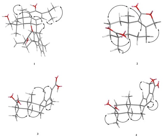 Compound 4 was isolated as yellowish oil. Its molecular formula, C20H28O4, was determined on the basis of the HR-EI-MS at m/z 330.1877 [M]+ (calcd for 330.1871) and was supported by the 1H, 13C, and DEPT NMR data. The IR absorption bands of 4 revealed the presence of COOH (2500~3400 cm−1), COOH (1696 cm−1), and conjugated γ-lactone (1778 cm−1) functions. The 1H- (Table 2) and 13C-NMR (Table 1) data of 4 were similar to those of 12-hydroxylabda-8(17),13-dien-18-oic acid-15,16-olide [16], except that one E-configuration double at C-11-12 (δH 6.37 (1H, d, J = 16.0 Hz, H-12), 6.13 (1H, dd, J = 16.0, 10.6 Hz, H-11); δC 139.2 (C-11), 124.2 (C-12)) in 4 replaced the CH2-CH(OH)- group [δH 1.75/2.20 (2H, m, H-11), 4.60 (1H, d, J = 9.6 Hz, H-12); δC 32.1 (C-11), 71.5 (C-12)] at the C-11-12 position of 12-hydroxylabda-8(17),13-dien-18-oic acid-15,16-olide [16]. The double bond with oxygen was in position C-15 and not in C-16 according to the NOE correlations of H-11/H-16. The full assignment of 1H and 13C NMR resonances was supported by 1H–1H COSY (Figure 2), DEPT, HSQC, NOESY (Figure 3), and HMBC (Figure 2) spectral analyses. Thus, the structure of 4 was established as shown in Figure 3, and named chamaecyformosanin D.