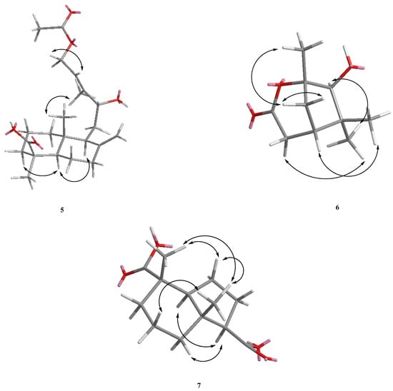 The following supporting information can be downloaded, Figure S1. 1H NMR spectrum of 1, Figure S2. 13C NMR spectrum of 1, Figure S3. 1H-1H COSY spectrum of 1, Figure S4. HMBC spectrum of 1, Figure S5. NOESY spectrum of 1, Figure S6. HSQC spectrum of 1, Figure S7. EI-MS spectrum of 1, Figure S8. 1H NMR spectrum of 2, Figure S9. 13C NMR spectrum of 2, Figure S10. 1H-1H COSY spectrum of 2, Figure S11. HMBC spectrum of 2, Figure S12. NOESY spectrum of 2, Figure S13. HSQC spectrum of 2, Figure S14. EI-MS spectrum of 2, Figure S15. 1H NMR spectrum of 3, Figure S16. 13C NMR spectrum of 3, Figure S17. 1H-1H COSY spectrum of 3, Figure S18. HMBC spectrum of 3, Figure S19. NOESY spectrum of 3, Figure S20. HSQC spectrum of 3, Figure S21. EI-MS spectrum of 3, Figure S22. 1H NMR spectrum of 4, Figure S23. 13C NMR spectrum of 4, Figure S24. 1H-1H COSY spectrum of 4, Figure S25. HMBC spectrum of 4, Figure S26. NOESY spectrum of 4, Figure S27. HSQC spectrum of 4, Figure S28. EI-MS spectrum of 4, Figure S29. 1H NMR spectrum of 5, Figure S30. 13C NMR spectrum of 5, Figure S31. 1H-1H COSY spectrum of 5, Figure S32. HMBC spectrum of 5, Figure S33. NOESY spectrum of 5, Figure S34. HSQC spectrum of 5, Figure S35. EI-MS spectrum of 5, Figure S36. 1H NMR spectrum of 6, Figure S37. 13C NMR/DEPT spectra of 6, Figure S38. 1H-1H COSY spectrum of 6, Figure S39. HMBC spectrum of 6, Figure S40. NOESY spectrum of 6, Figure S41. HSQC spectrum of 6, Figure S42. EI-MS spectrum of 6, Figure S43. 1H NMR spectrum of 7, Figure S44. 13C NMR/DEPT spectra of 7, Figure S45. 1H-1H COSY spectrum of 7, Figure S46. HMBC spectrum of 7, Figure S47. NOESY spectrum of 7, Figure S48. HSQC spectrum of 7, Figure S49. EI-MS spectrum of 7.