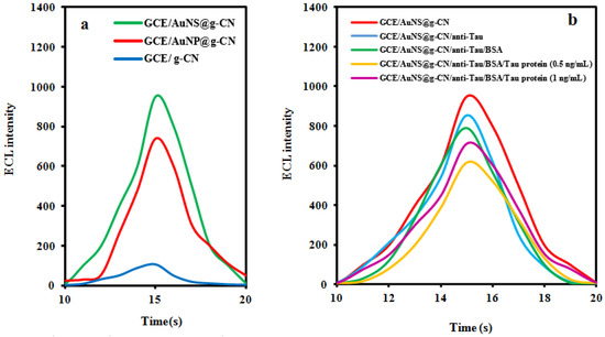 The ECL intensities obtained using AuNP@g-CN and AuNS@g-CN nanostructure systems (Figure 2a, red and green curves, respectively) were enhanced by 7 and 9 times, respectively, higher than that of the g-CN nanosheet/GCE system (Figure 2a, blue curve). The mechanism of enhancement is attributed to the catalytic effect of AuNPs on the S2O82− reduction process [24]. Moreover, the more effective enhancement of AuNSs systems from the special shape is due to the concentrate electron density around the spikes. In addition, AuNSs show a strong LSPR effect concentrated around the tips of branches which remarkably amplified the ECL intensity by producing more charge carriers. This enhancement mechanism has been reported in the literature [28,29].