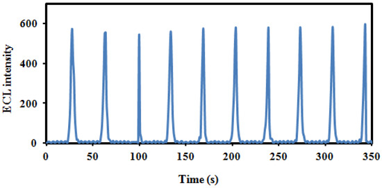 The stability of the ECL emitting materials is the most important parameter for analytical application. Figure 3 show the ECL stability of the immunosensor response for detecting 1 ng/mL of Tau protein. Under 10 cycles of a successive cyclic potential scan, the ECL intensity was extremely stable, and the RSD was 3.3. Furthermore, when the GCE/AuNS@g-CN immunosensor was stored at 4 °C, it was stable for more than 2 weeks, and the ECL intensity was 97.4% of the original ECL value after 2 weeks.