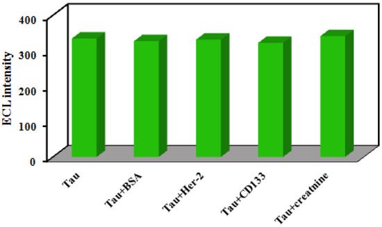 The specificity of the developed immunosensor for Tau protein determination was investigated to survey its feasibility. Some possible interferences containing BSA, creatinine, HER-2, and CD133 peptide were added to 1 ng mL−1 of the Tau protein solution with a concentration 100 times higher than Tau protein (the concentration of interferences were 100 ng mL−1). As displayed in Figure 5, the ECL response of the immunosensor for Tau in the presence of interferences varied less than 5% of the response to pure Tau, suggesting that the immunosensor has admissible specificity for the quantification of Tau protein in serum samples.