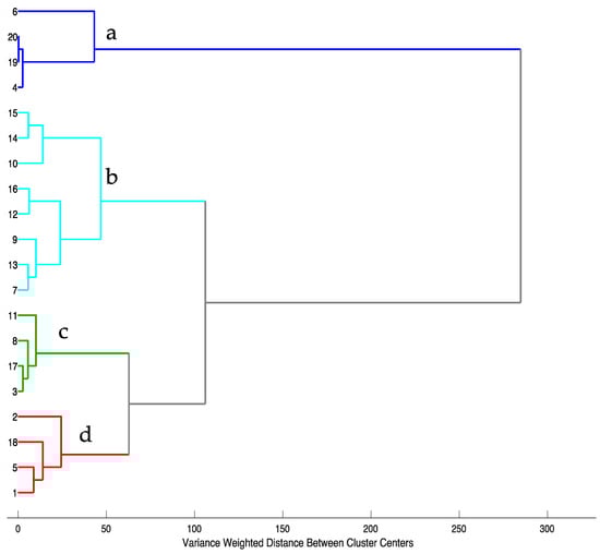 Figure 2 shows the result of a hierarchical cluster analysis of food supplements based on the data in Table 1. In this analysis, four clusters were identified. The first cluster (a) consists of S4, S6, S19, and S20, with rutin as the dominant component. Cluster c comprises supplements (S3, S8, S11, and S17) having a comparable level of quercetin and kaempferol (approximately 1:1). In contrast, cluster b contains the most numerous supplements with a high and prevailing quercetin content. Cluster d comprises supplements S1, S2, S5, and S18, which demonstrate a relatively low percentage of all flavonols without any dominant compound.