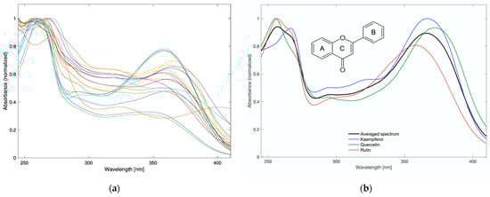Figure 3a shows UV-Vis spectra of methanolic extracts from food supplements and Figure 3b shows spectra of the three most common adulterants of the ginkgo biloba extract. Two aromatic rings (A and B) linked by heterocycle ring C form the basic flavonoid structure. In the UV-Vis region, flavonoids show two leading absorption bands: in the range 320–385 nm, which corresponds to ring B (cinnamoyl system, the band I), and in the range 240–280 nm, which corresponds to ring A (benzoyl system, band II) [16]. In the spectrum of rutin, absorption maxima are at 257 nm and 355 nm, quercetin has two bands with a maximum at 255 nm and 368 nm, and kaempferol shows the maximum absorption at 265 nm and 365 nm [16].