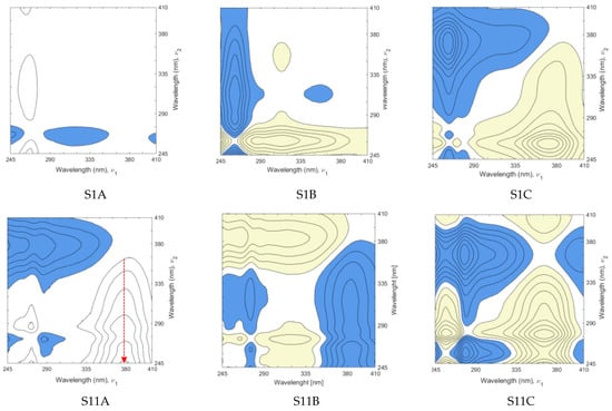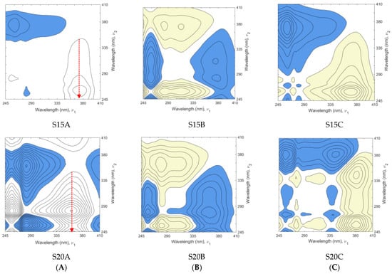 Figure 4 shows four exemplary 2T2D asynchronous correlation spectra (from series A, B, and C), representing the individual clusters in Figure 2. S15 (from cluster b) and S20 (included in cluster a), which are examples of supplements with quercetin and rutin as the dominant adulterant, respectively. S11 is an example of a supplement adulterated with quercetin and kaempferol (cluster c), while S1 represents cluster d. The other 2T2D asynchronous correlation spectra are shown in Figure S5 (Supplementary Material).