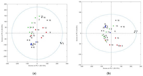 According to information from chromatographic profiles, the selected supplements are marked with different colors representing three groups: products with rutin as the main component (blue), supplements with quercetin as the main component (red), and supplements with both quercetin and kaempferol as the main components (green). In Figure 6a, supplements S4, S19, S20, and S6 are close to each other and rutin (R), which shows their similarity. Supplements S1 and S5 are dissimilar from other supplements.