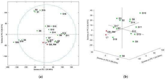 MPCA scores plot base on 2T2D correlation maps calculated for food supplements (sample spectra) vs. averaged spectrum of adulterants: kaempferol, quercetin, and rutin (reference spectrum), RMSEC: 0.066; RMSECV: 0.107; (a) plot including all samples; (b) MPCA scores plot after excluding samples S1, S4, S5, S15, S16, S19, and S20, RMSEC: 0.140; RMSECV: 0.264.
