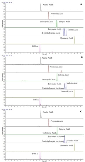 LC-MS profile (extracted ion chromatogram) of SCFA and BHBA acquired in positive ionisation mode from standards (3.3 µg/mL each or 28~55 µmol/L) (A), non-spiked raw milk (B) and non-spiked serum (C).